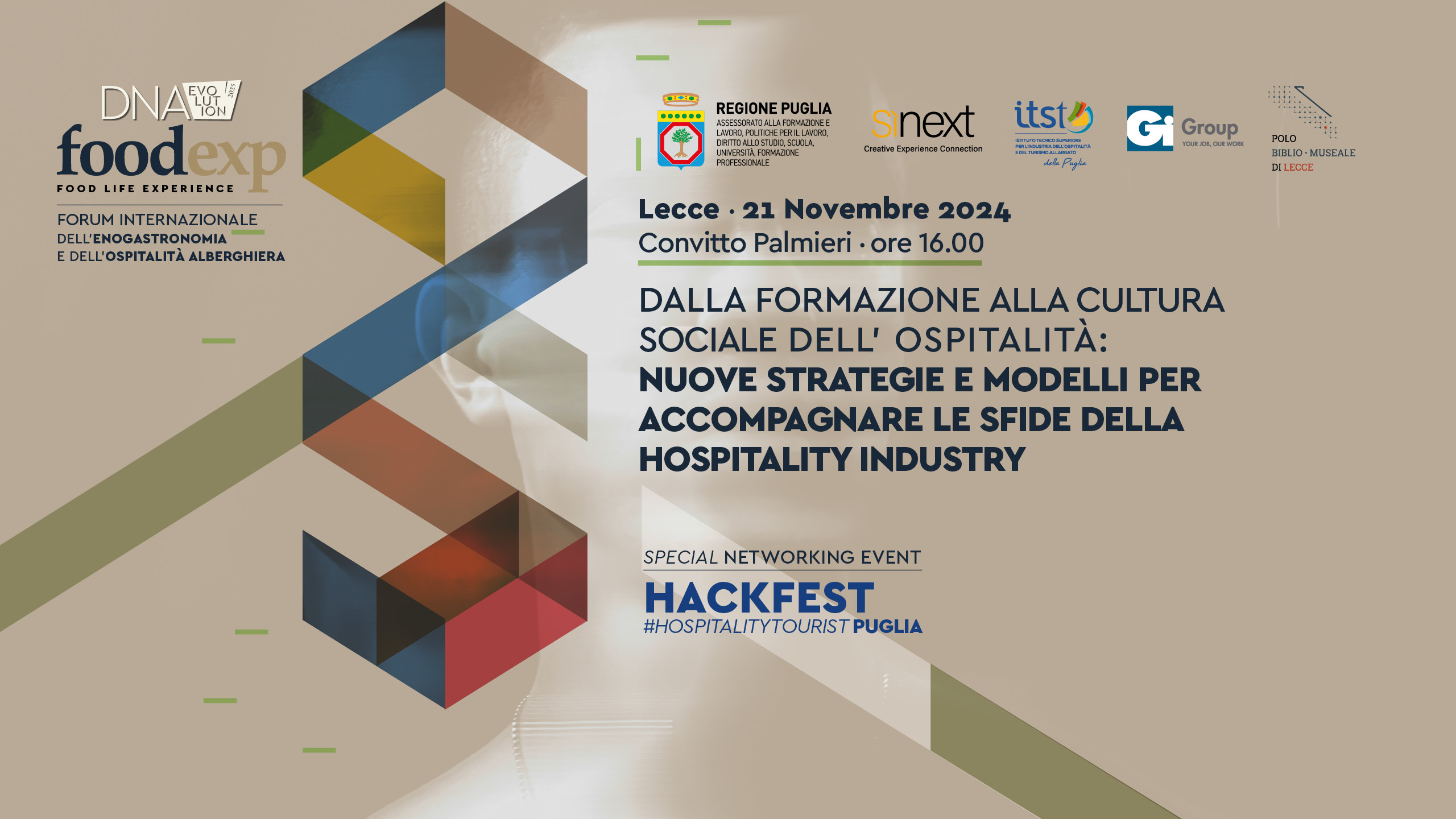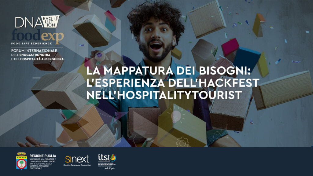PRIMA EDIZIONE HACKFEST IN PUGLIA ..100 TESTE   22 Novembre Lecce       Nel contesto in continua evoluzione del mondo del lavoro e della società, il futuro della formazione, dell’apprendistato e dello sviluppo delle nuove competenze è un argomento di grande rilevanza e complessità.  Il progetto nasce con l’obiettivo di rinnovare la programmazione strategica dei processi e dell’offerta formativa pugliese in ambito Hospitality Industry, integrando nuove strategie, modi di percezione, adattamento e innovazione dei fabbisogni delle aziende nel settore turistico pugliese, in particolar modo per le competenze  dell’ospitalità contemporanea.  Oggi, il termine ‘HACKTON’ è associato  concetti quali la creatività, l’innovazione, la competitività e viene utilizzato per esplorare nuovi campi d’azione, sviluppare prodotti innovativi o strategie aziendali. I partecipanti degli hackathon saranno suddivisi in 10  squadre e 10 temi ,  create sulla base di sfide comuni, con l’obiettivo di produrre idee/soluzioni in un arco di tempo ben delimitato. Tali condizioni permettono di sviluppare competenze trasversali, socializzare ed essere produttivi in contesti diversi e stimolanti, riuscendo a combinare gestione del tempo, stress e risorse in maniera efficace. A tal proposito, HACKFEST si propone di esplorare l’impatto degli hackathon nell’industria alberghiera pugliese attraverso la formazione di team/tavoli multidisciplinari: l’obiettivo principale è fornire informazioni di valore e rilevanza per gli stakeholder coinvolti con il fine di suggerire possibili aree di miglioramento ed opportunità di crescita nel settore dell’ospitalità. Vi aspettiamo …