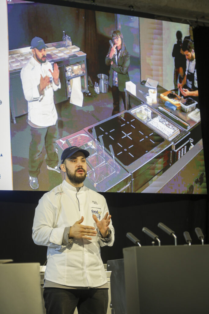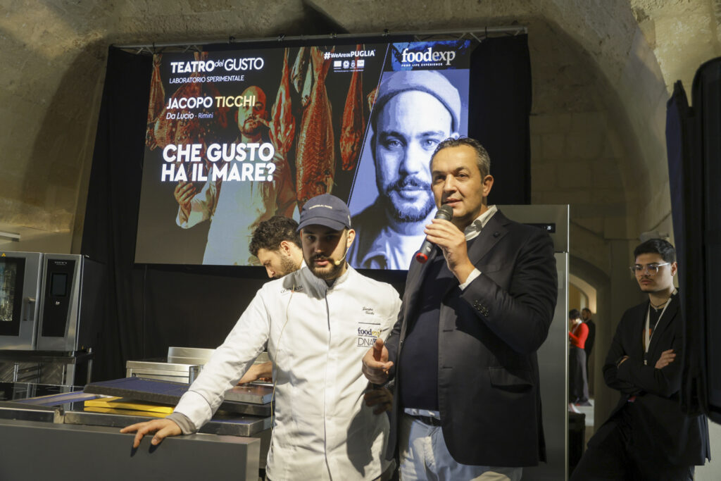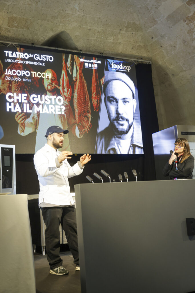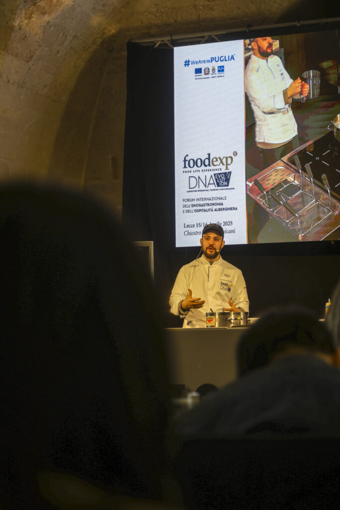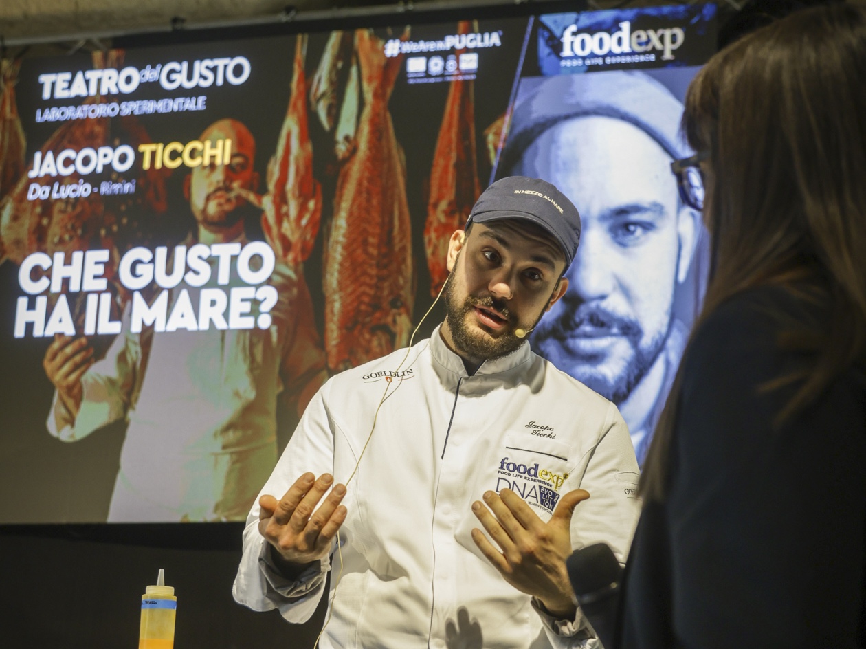 Da qui la ricerca di nuove strade, esplorando varietà dimenticate, con un invito a masticare il gusto del cambiamento. È proprio il gusto del mare che ha riproposto, per l’occasione, a FoodExp 2025, in una rana pescatrice cruda accompagnata da acqua di geranio e tabasco, quasi a ricordare una caramella dolce ma pungente; quindi, la masticabilità del polpo crudo con il limone di mare; infine, le alghe wakame a mo’ di spaghetto alle vongole perché «per me il mare ha il sapore dell’aglio, olio e prezzemolo».