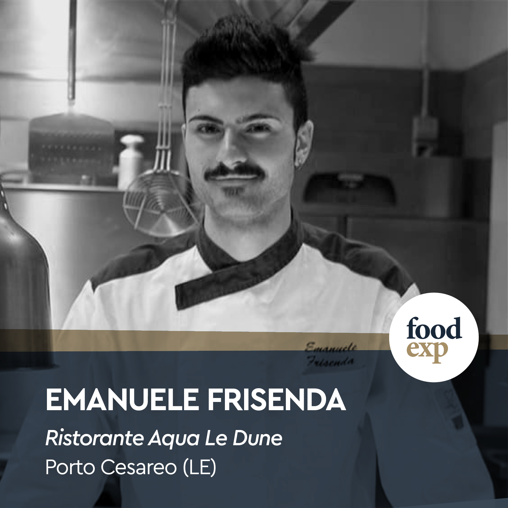 Emanuele Frisenda, nasce a Leverano in provincia di Lecce nel 1995, fin da bambino sognava di diventare cuoco, il suo primo ricordo fu il profumo della salsa di pomodoro a casa della nonna. Da due anni è il responsabile della cucina al ristorante Aqua Le Dune a Porto Cesareo. La persona che è stata d’esempio per Emanuele è lo chef Cosimo Russo che gli ha trasmesso il piacere di stare in cucina, di creare piatti e di essere sempre pronto a risolvere ogni situazione.