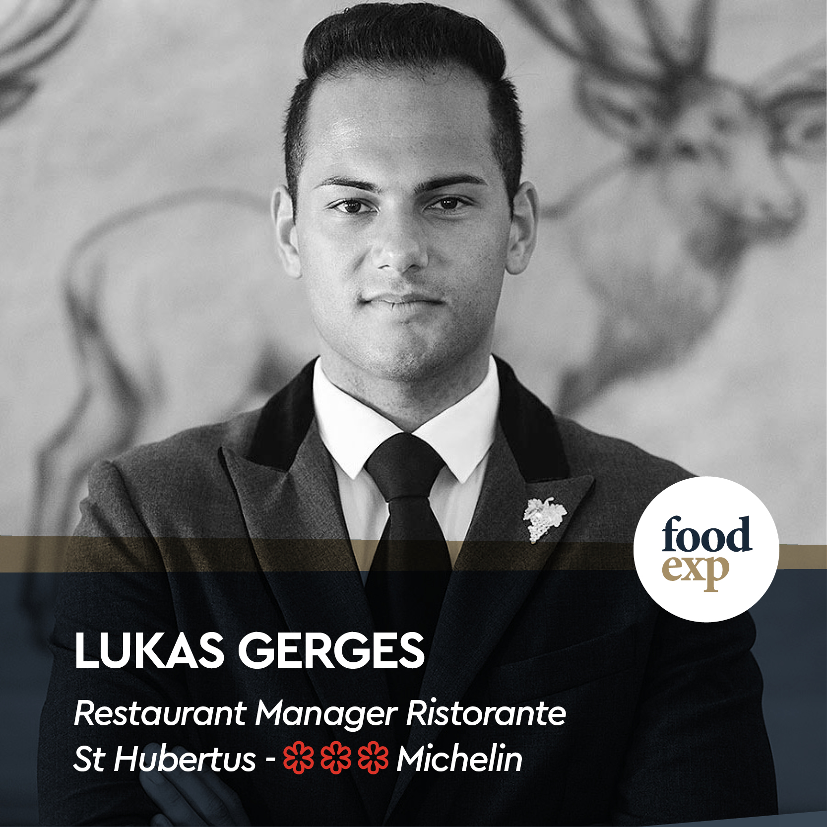 Lukas Gerges, nato nel 1991 a Lienz (Austria), e cresciuto in una piccola pensione con annesso panificio situato nell’Est del Paese, è stato sin da bambino in contatto con l’arte gastronomica. Finita la scuola alberghiera, e dopo varie esperienze lavorative in Italia, Austria, Svizzera, Germania e Irlanda, si è unito al Team del Ristorante St. Hubertus come Chef de Rang ed assistente del Primo Sommelier. Passate alcune stagioni ricoprendo questo ruolo, viene promosso ad assistente Maître per poi raggiungere la posizione di Restaurant Manager e Head Sommelier nell’estate 2018